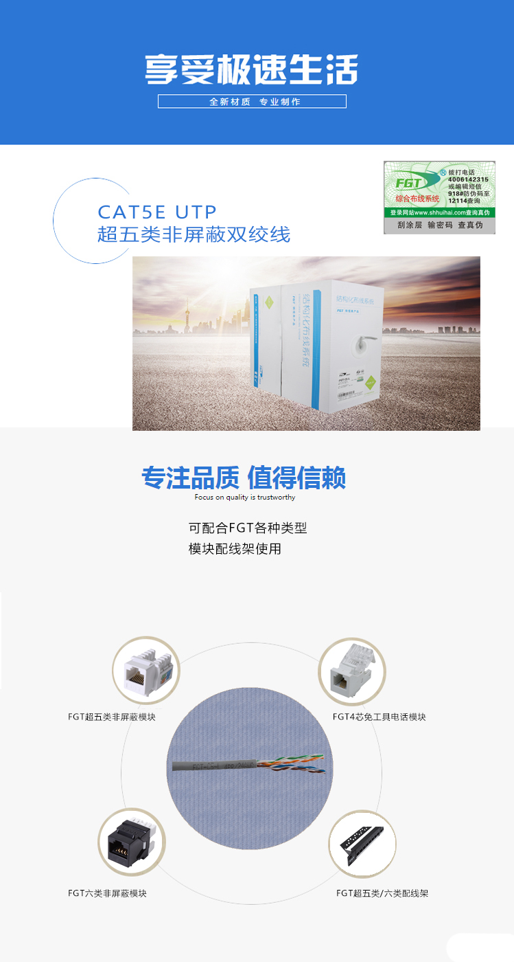 超五類4對非屏蔽水平對絞數據電纜是為支持高速網絡傳輸而設計的,參考標準: GB/T 50312 、YD/T 1019、ISO/IEC 11801 ANSI/TIA-568.2-D。